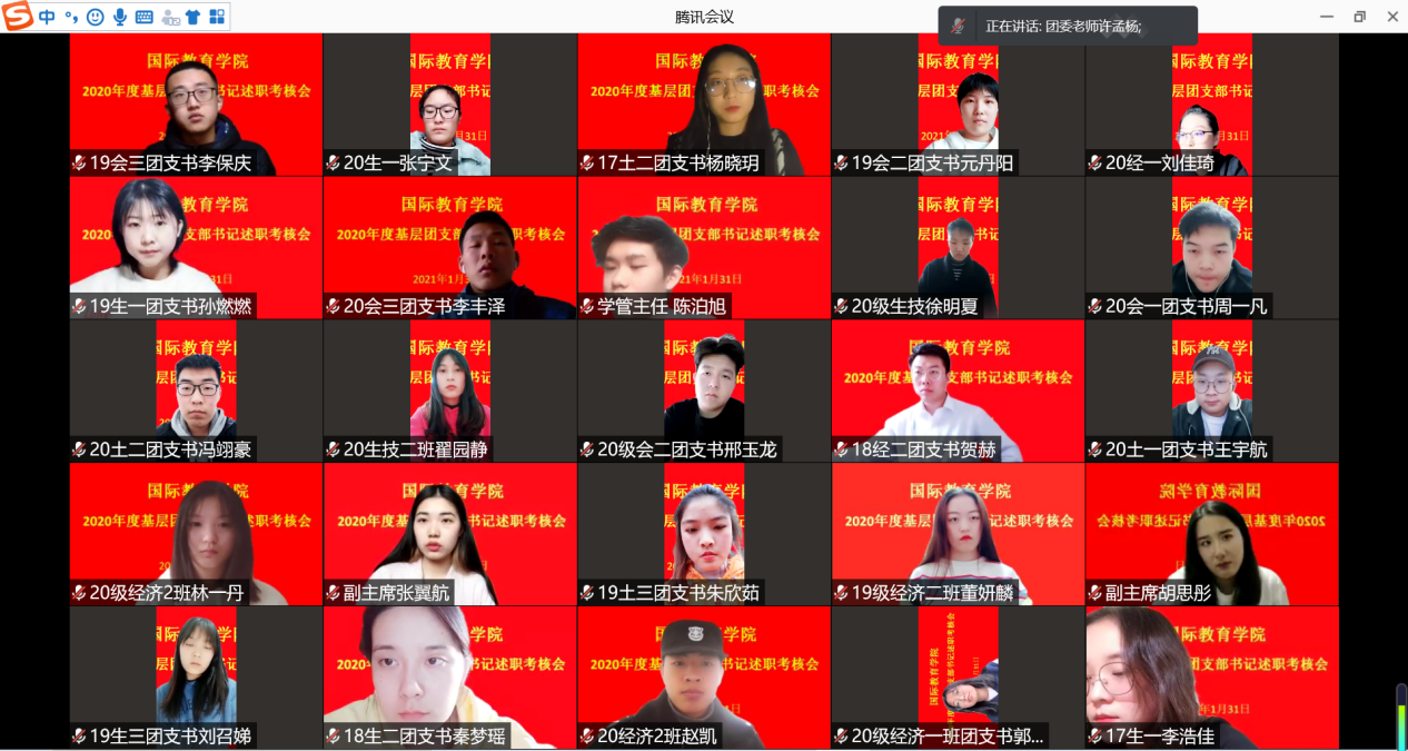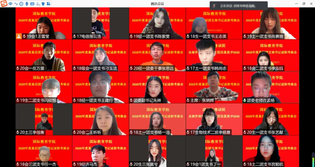 为贯彻落实团中央《关于在全省集中开展基层团组织书记述职评议考核工作的通知》(豫团组通字[2021]2号)精神和全面从严治团要求,激发基层团组织活力,提高工作部署的落实成效,2021年1月31日,英国365上市公司团委采用线上述职方式开展基层团支部书记述职考核工作。学院团委老师许孟杨、各团支部书记以及分团委组织人员参加此次述职工作,会议由学院分团委副书记朱琳主持。