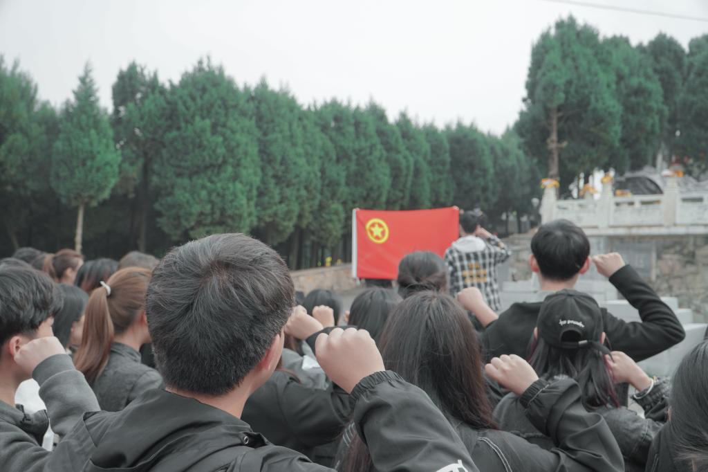 上午九点半,带队老师与同学们乘坐巴士,到达陵园并有序进入。在陵园中央曹灿章将军的纪念碑前面,由学生党员王倍起主持的悼念仪式在庄严肃穆的氛围中举行。青年学子在纪念碑前排成整齐的方阵,向烈士敬献花篮。随后,同学们在革命烈士纪念牌前,怀着崇高的敬意和悲壮的心情三鞠躬、默哀一分钟,并环绕纪念碑一周,献上一朵朵小白花,以此表达自己对先烈们的感恩之心、敬仰之情、缅怀之意。同学们在青年团员史俊鹏的带领下重温了入团誓词,再次接受了一次思想洗礼,铮铮誓词震撼人心。