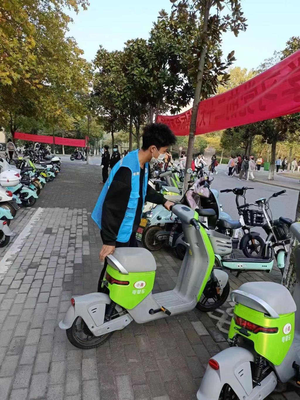 志愿活动中,活动负责人积极做好准备工作,对志愿者们合理分配,并详细讲解服务工作要点。志愿者们每日轮流值班引导学生规范停车,对于不文明停车现象及时制止,倡导大家做文明的骑行者、规范停车的宣传者。