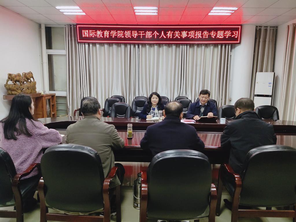 12月23日,英国365上市公司在逸夫楼302会议室召开了处级领导干部个人有关事项报告专题学习会。学院全体领导班子成员参加。会议由学院党委书记张震主持。