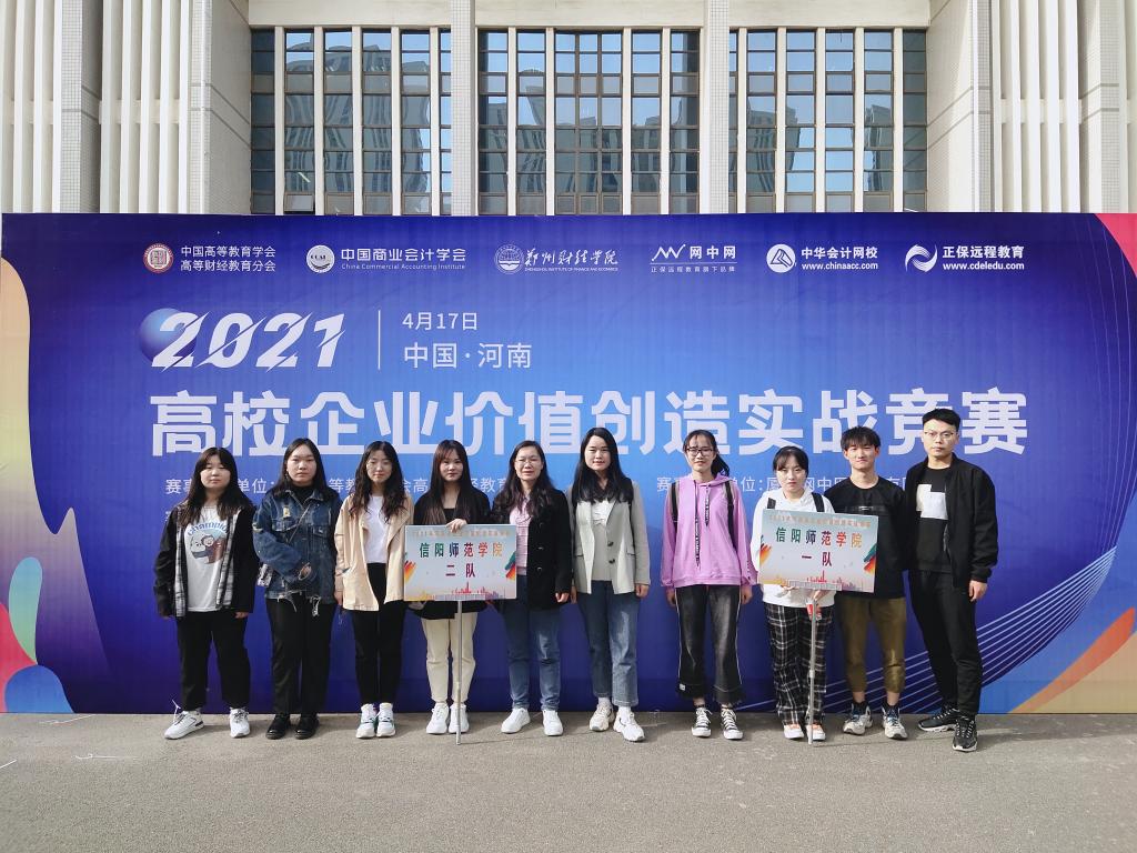 4月17日,2021年河南省高校企业价值创造实战竞赛在郑州财经学院举行。本次大赛由中国商业会计学会主办、郑州财经学院承办,全省29个院校、56支代表队参加。我院2018级张恒等4名学生组成的信阳师范学院第一代表队荣获二等奖。