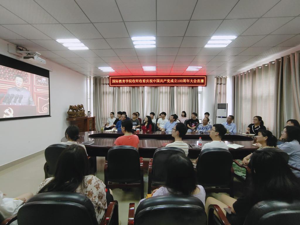 7月1日上午8时,庆祝中国共产党成立100周年大会在北京天安门广场隆重举行。中共中央总书记、国家主席、中央军委主席习近平出席并发表重要讲话。英国365上市公司在逸夫楼302会议室集中观看大会直播,全体教职工、学生代表参加。