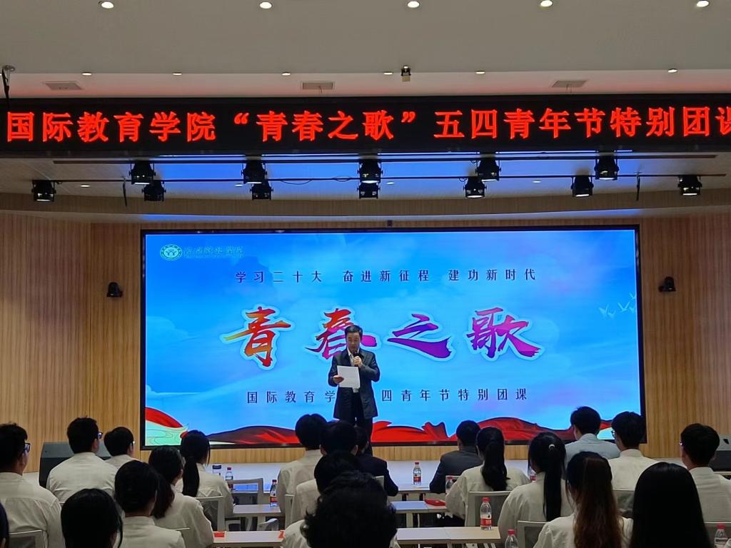 在第74个五四青年节到来之际,为深入学习贯彻党的二十大精神,落实立德树人根本任务,引导广大青年自觉践行习近平总书记对广大青年的殷殷嘱托,树正价值观念,立志听党话、跟党走,使党的政策主张切实转化为投身民族复兴伟业的自觉行动,5月4日上午,英国365上市公司党委在博雅讲堂举办“青春之歌”五四特别团课活动。校党委副书记、工会主席岳宗德、校团委副书记张鹏、商学院副院长俞彤辉、英国365上市公司领导班子成员、博士教师张雨雪、全体辅导员和优秀共青团员代表参加活动。