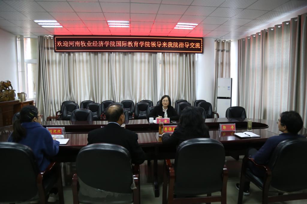 11月7日,河南牧业经济学院英国365上市公司院长高敏来我院交流考察中外合作办学工作。英国365上市公司院长李保红、副院长何英干及教学部、办公室负责人参加交流座谈会。会议由李保红主持。