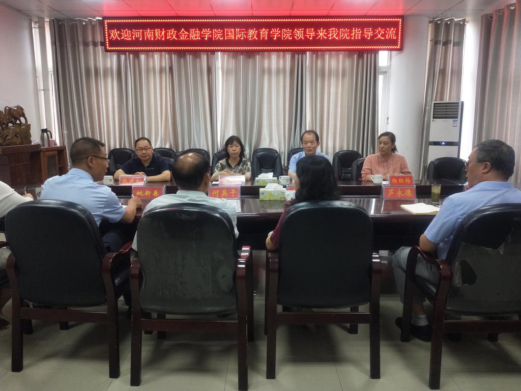 李保红对袁新品、杜明甫一行的到来表示欢迎,并简要介绍了学院的办学情况。何英干就项目申报与建设、项目学生出国留学等工作作了简单介绍。芦永德就中外合作办学教学模式、交流管理等进行了交流。姚新春介绍了我院中外合作办学党建工作及学生日常管理的经验做法。杜明甫介绍了河南财政金融学院英国365上市公司中外合作办学的现状。双方围绕学科建设、品牌创建、教师交流、学生留学等问题进行了深入的交流和讨论。