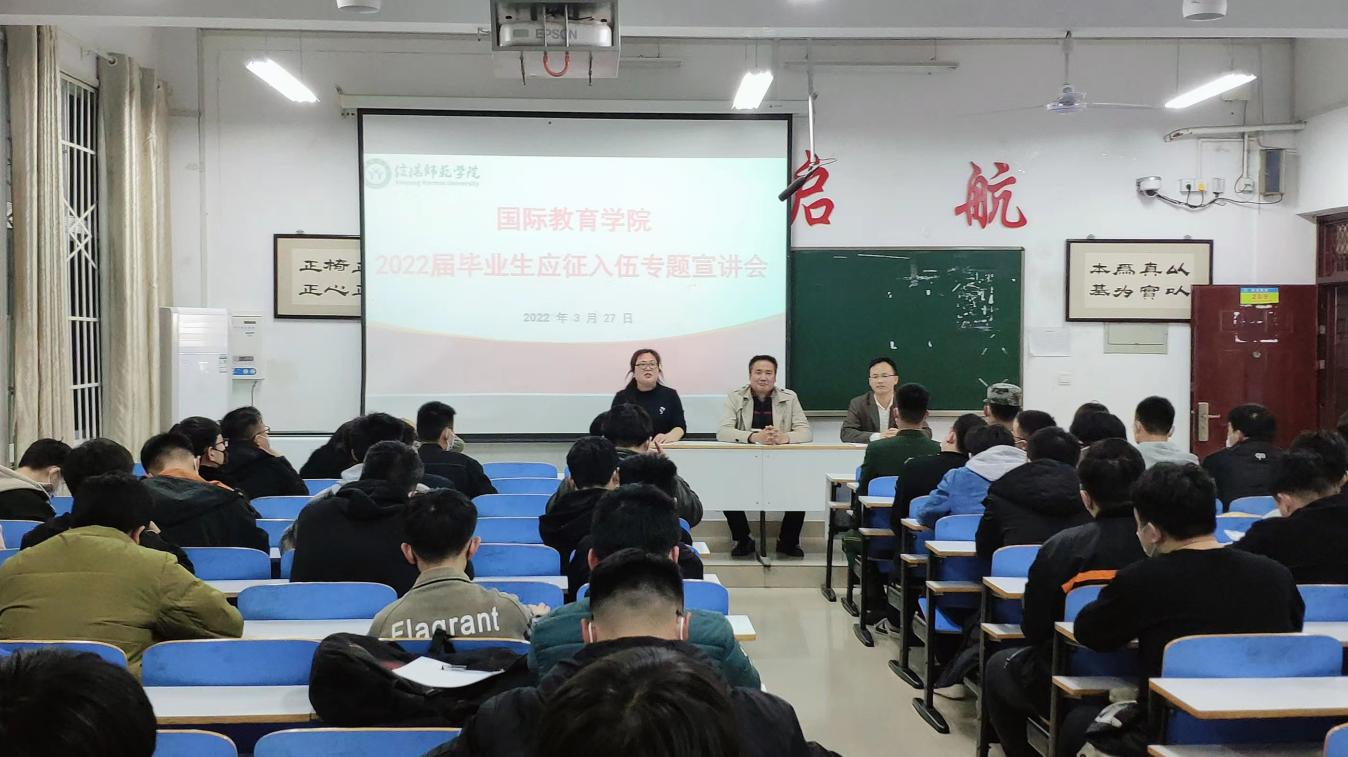 为深入贯彻落实习近平总书记的强军兴军思想,激发大学生参军热情,推动我院征兵工作常态化、高质量发展,3月27日晚,我院2022届毕业生应征入伍宣讲会在逸夫楼209教室召开。学生处武装部副部长苏和出席会议,院党委副书记付春锋、武装干事沈艳霞、全体专职辅导员、退伍学生代表以及18级全体男生参加会议。会议由付春锋主持。