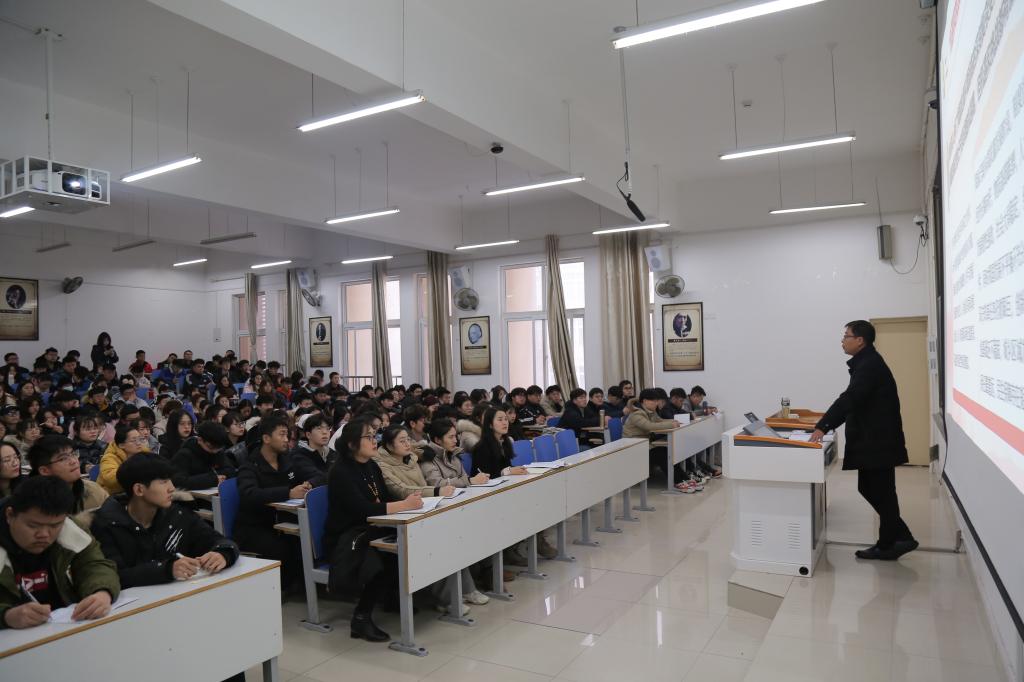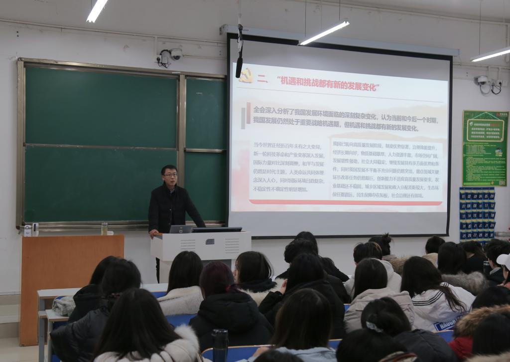 姚新春作党的十九届五中全会精神专题宣讲。他对十九届五中全会公报中的“十个新表述”,从领航掌舵、机遇和挑战都有新的发展变化、全体人民共同富裕、全面建设社会主义现代化国家、坚持系统观念、产业基础高级化、产业链现代化、身心健康素质、科技自立自强、扩大内需战略同深化供给侧结构性改革有机结合、富国和强军相统一等十个方面进行了详细的阐述。他指出,大学生不仅要学好专业知识,也要了解国家政策和国家发展规划,将小我和大我有机结合起来,把爱国情、报国志融入伟大奋斗,为实现中华民族伟大复兴的中国梦贡献智慧和力量。